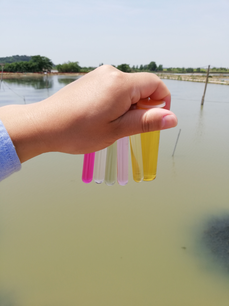 能量型肥水后水体肥度可以通过对氨氮和亚盐的数据监控进行分析。如图同一个池塘,在5月20日清晨用肥水膏氨基酸母液进行全池能量肥水,测量时能够明显看到氨氮1.1mg/L,亚盐0.15mg/L,在5月26日测量时氨氮0.4mg/L和亚盐0.05mg/L。