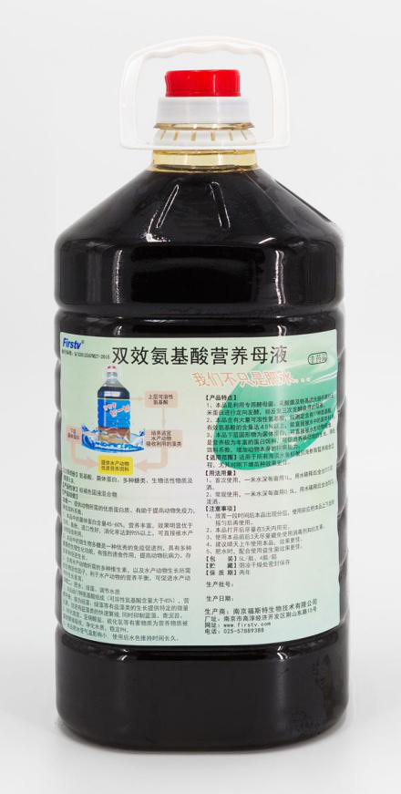 双效氨基酸母液,主要成分氨基酸、菌体蛋白、微生物多糖、生物活性物质及微量元素。利用专用酵母菌乳酸菌及大肠杆菌对玉米蛋白进行定向发酵,经反复三次发酵获得母液,可溶性氨基酸17种以上,有效氨基酸含量45%以上,能够直接被水体中的浮游植物利用。菌体蛋白也可直接被浮游动物直接摄食,营养平衡,能为硅藻、绿藻、等有益藻类的生长提供特定的微量元素,促进有益藻类的快速繁殖。净化水质,稳定pH,氨基酸组成丰富,极大程度上丰富物种,稳定水体。下层菌体蛋白含量45%-60%,可直接被水产动物吸收利用,消化率高达95%以上,微生物多糖也是优秀的免疫促进剂,具有多种重要的生理生化功能,有强烈优势作用,提高动物抗病力、存活率和促进生长。