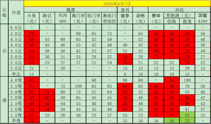 今日(2020.9.7)成蟹报价,各位老板根据情况选择销售。绿色标记为较前一日增长,红色标记为较前一日下跌