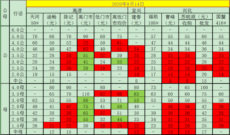 成蟹报价,各位老板根据情况选择销售。绿色标记为较前一日
