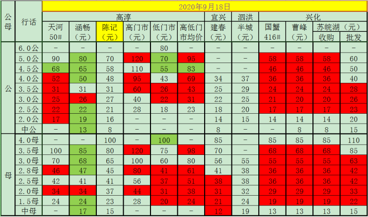 今日(2020.9.18)成蟹报价,各位老板根据情况选择销售。绿色标记为较前一日增长,红色标记为较前一日下跌