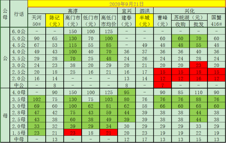 成蟹报价,各位老板根据情况选择销售。绿色标记为较前一日