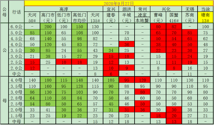 今日(2020.9.27)成蟹报价,各位老板根据情况选择销售。绿色标记为较前一日增长,红色标记为较前一日下跌