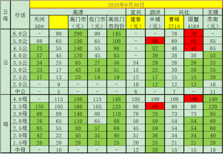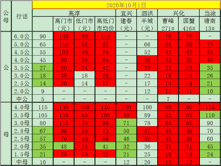 今日(2020.10.1)成蟹报价,各位老板根据情况选择销售。绿色标记为较前一日增长,红色标记为较前一日下跌。