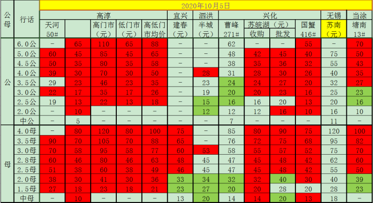 今日(2020.10.6)成蟹报价,各位老板根据情况选择销售。绿色标记为较前一日增长,红色标记为较前一日下跌。