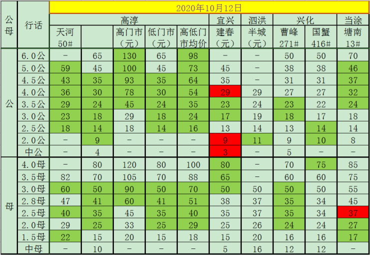 今日(2020.10.12)成蟹报价,各位老板根据情况选择销售。绿色标记为较前一日增长,红色标记为较前一日下跌