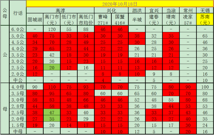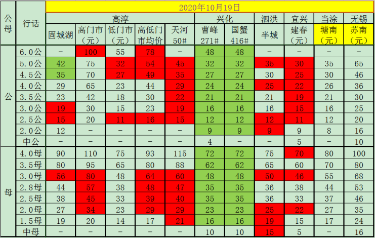 今日(2020.10.19)成蟹报价,各位老板根据情况选择销售。绿色标记为较前一日增长,红色标记为较前一日下跌。